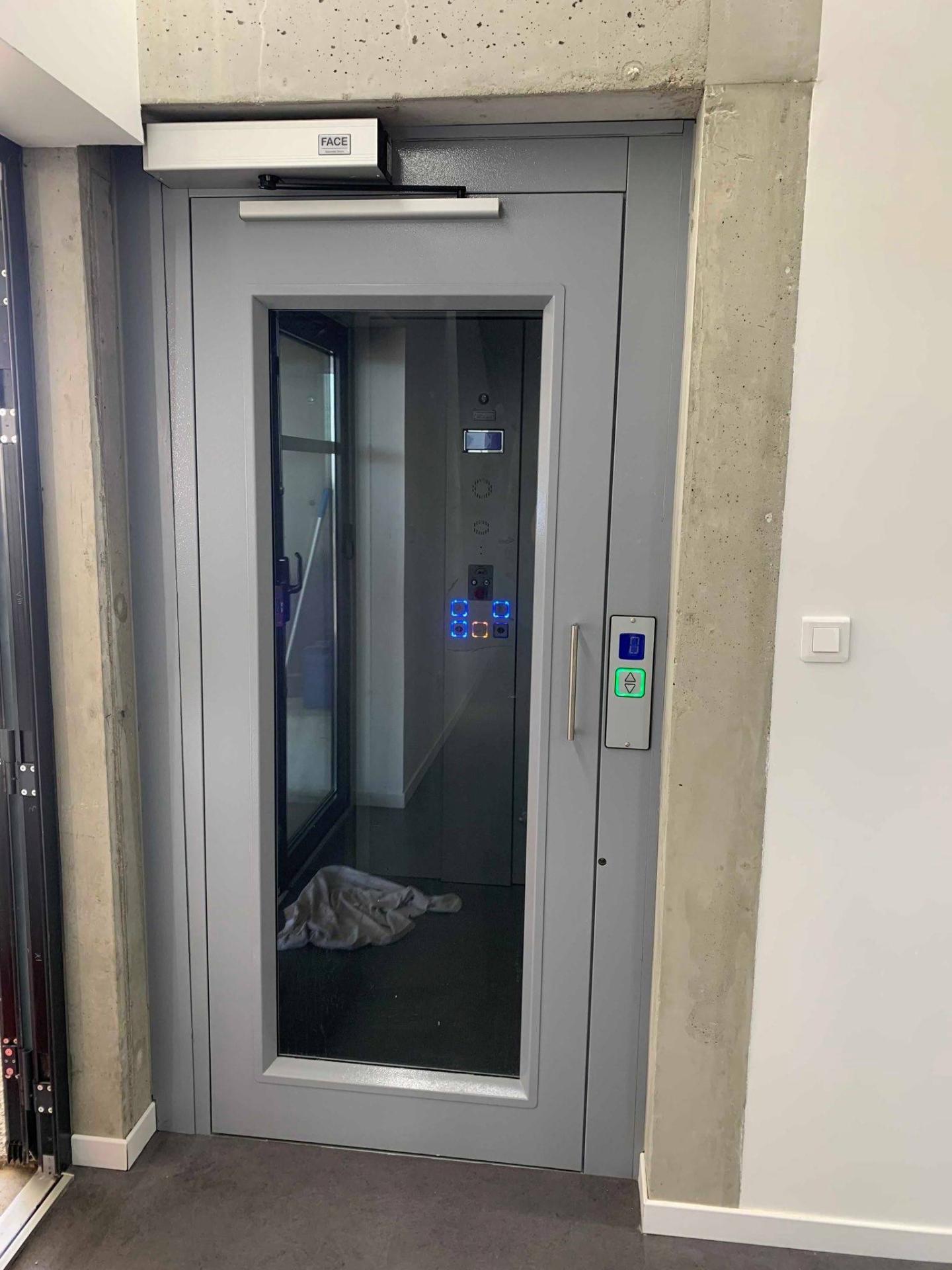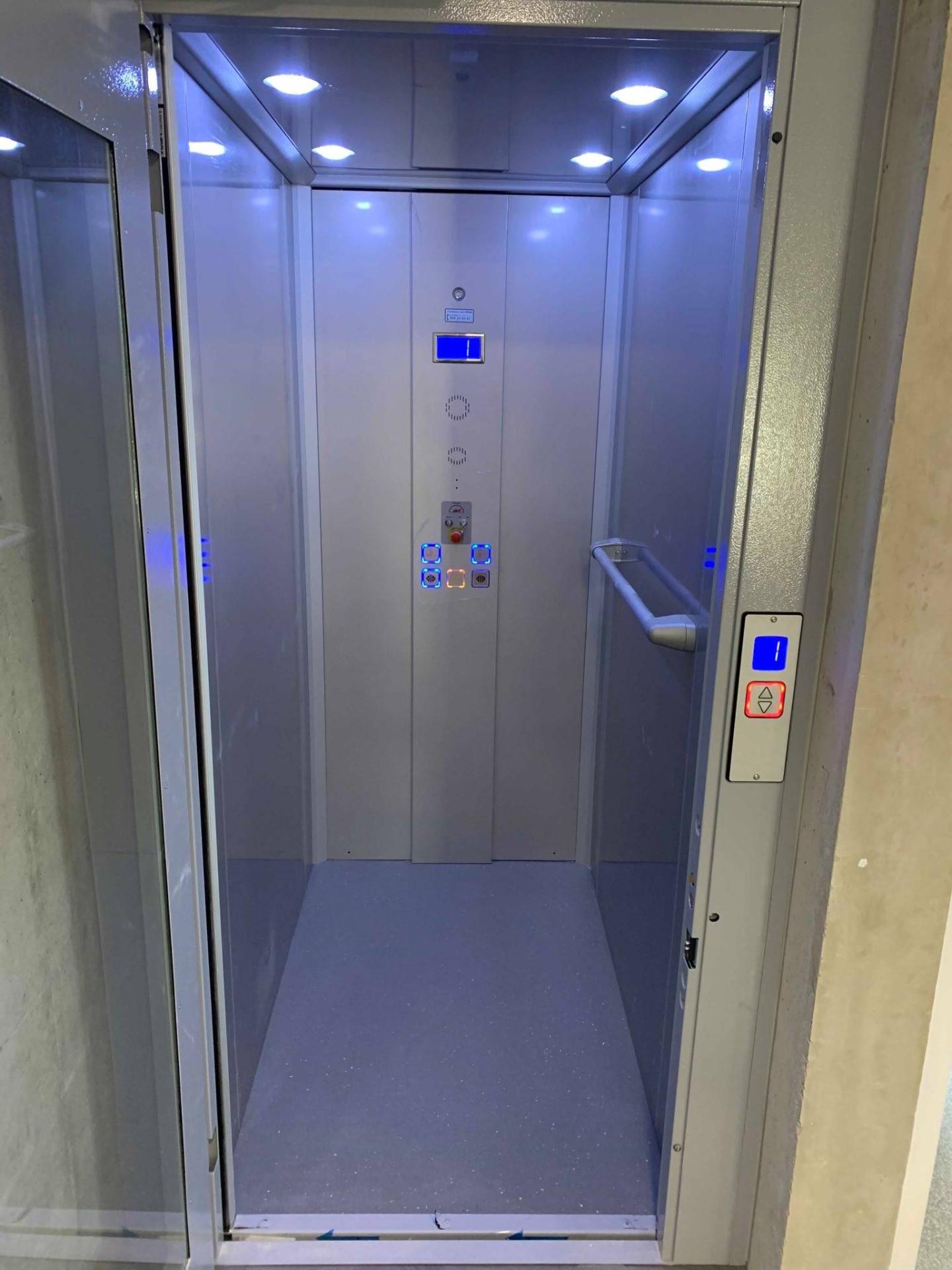 La dimension du plateau intérieur permet d'obtenir un passage libre au niveau des portes de 860 mm, compatible avec tous les modèles de fauteuil roulant. la charge utile de cet ascenseur privatif est de 400 kg.