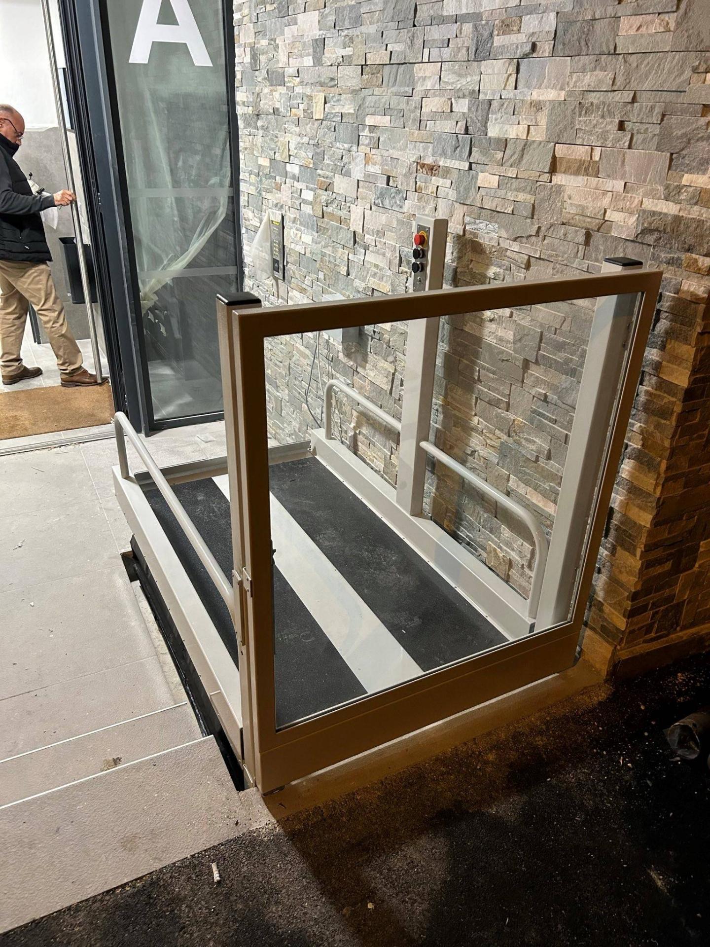 Voici avec ce mini élévateur LEHNER LIFTBOY, installé à la Ciotat (13) près de Marseille une possibilité offerte pour franchir 4 marches donnant accès à un hall d’immeuble.