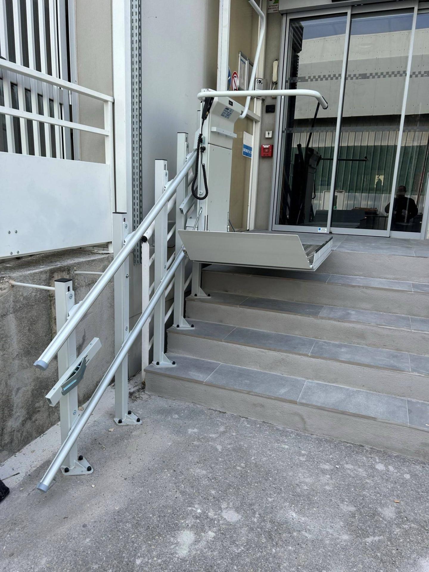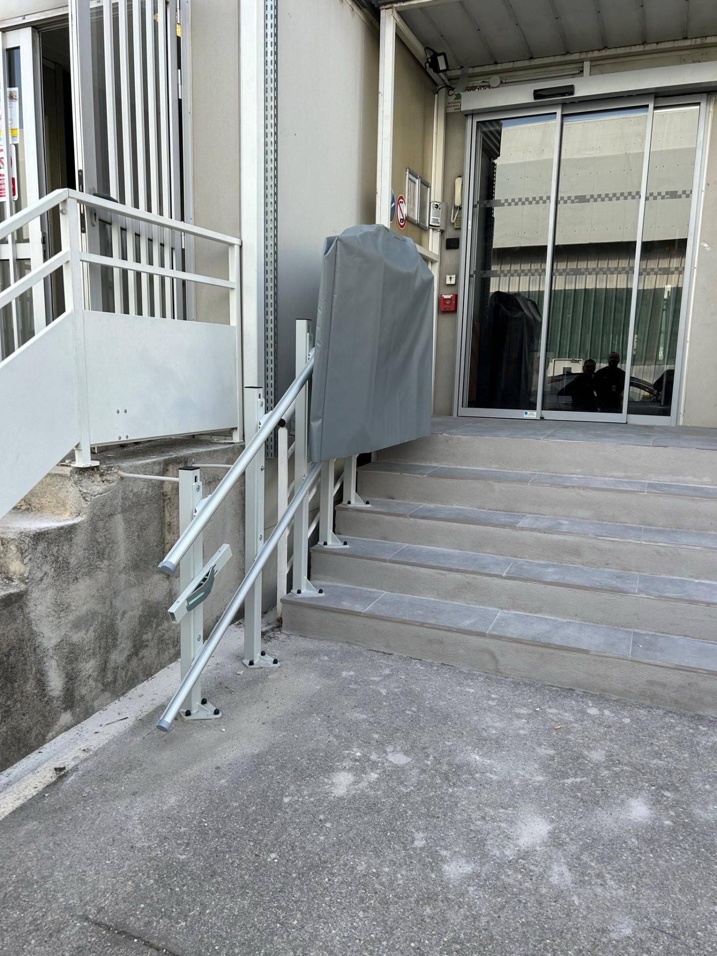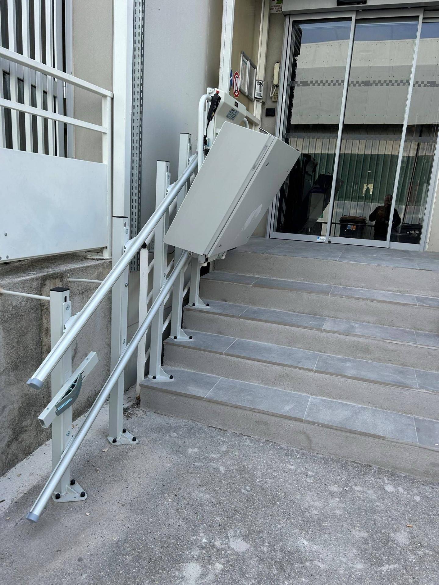 L’installation d’élévateurs verticaux, plateformes obliques, ascenseurs de maison ou fauteuils monte escalier en intérieur et en extérieur a installé une plateforme oblique dans un escalier droit en extérieur LEHNER DELTA à Marignane près de Marseille.