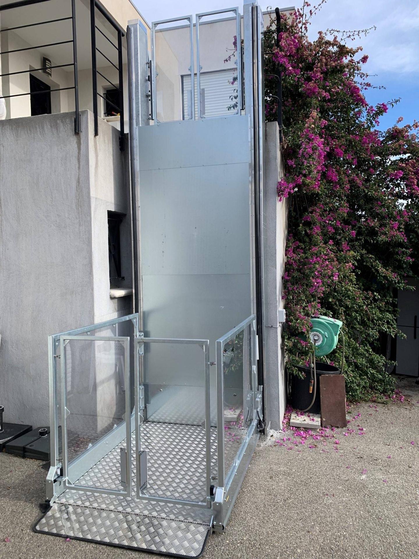 La plateforme verticale implantée, vient s'ajuster parfaitement à la porte qui lui est dédiée et permet l'accès à l'étage pour une personne en fauteuil roulant.
