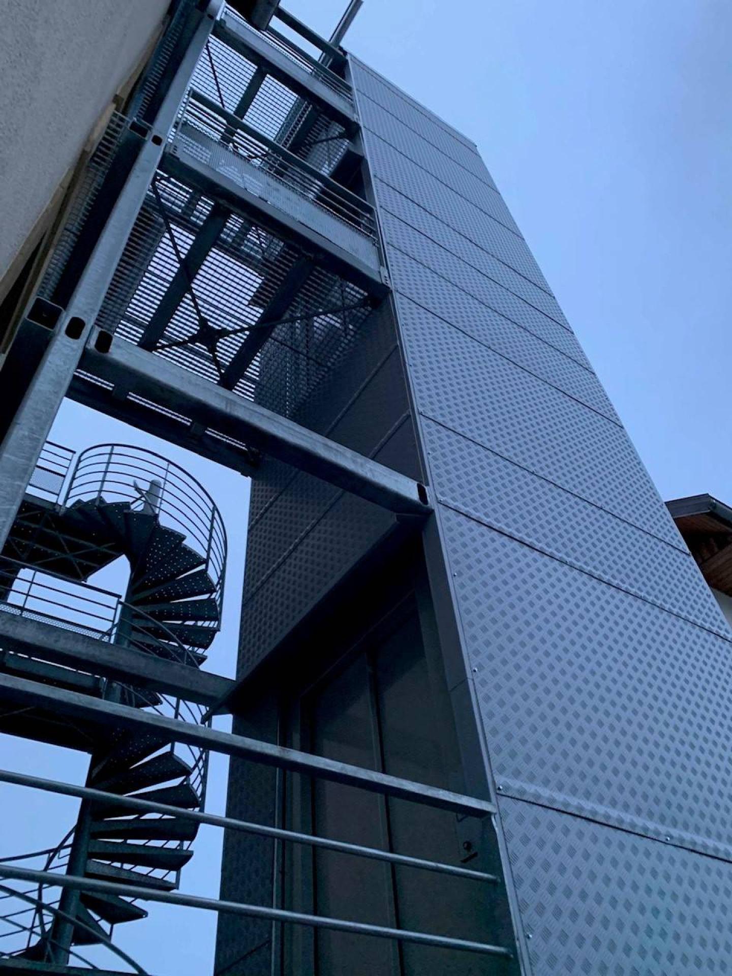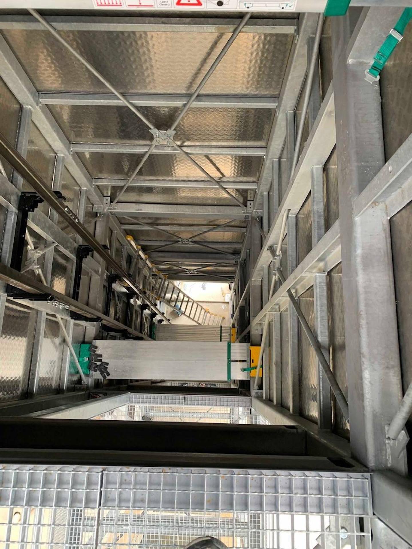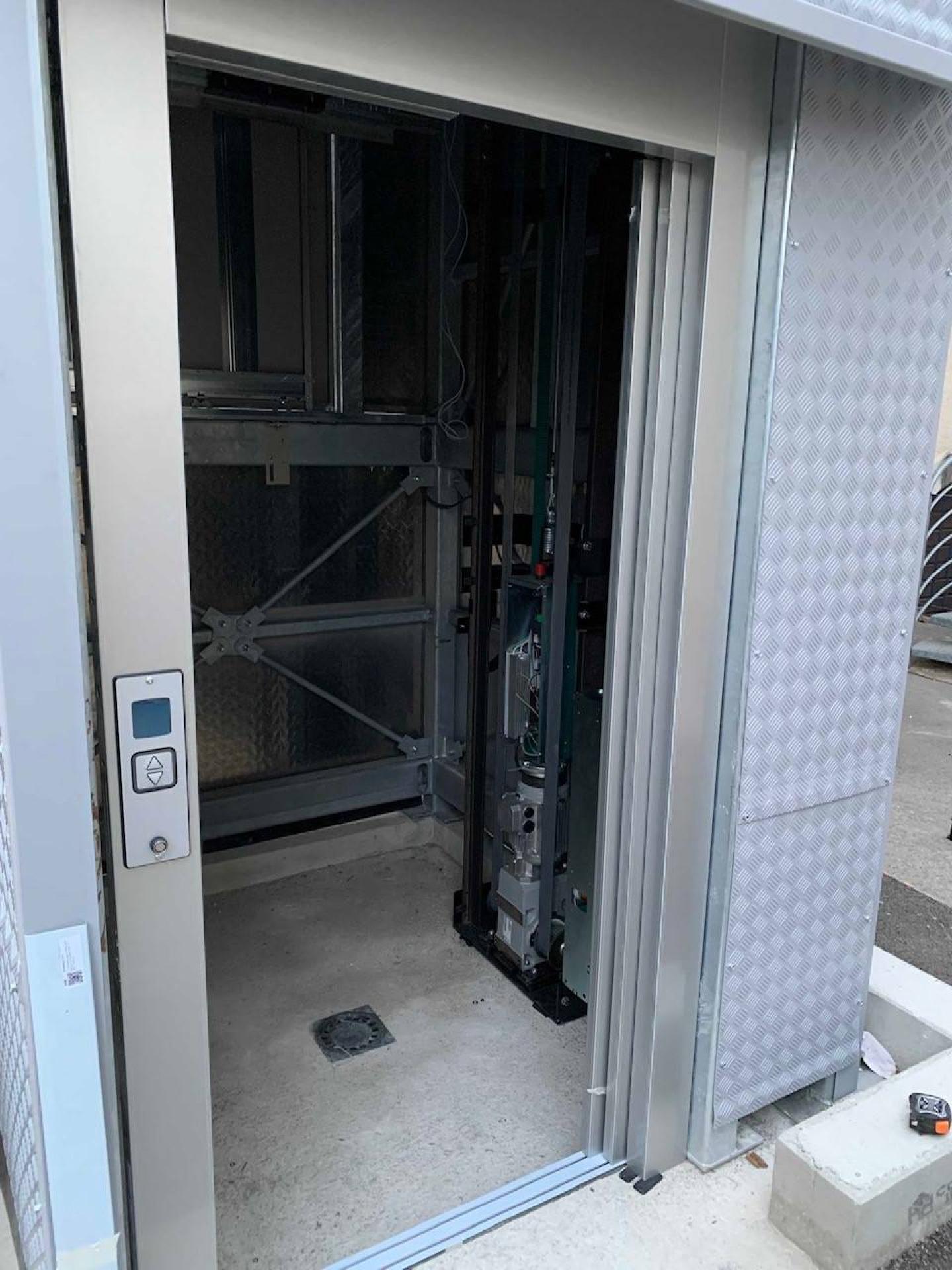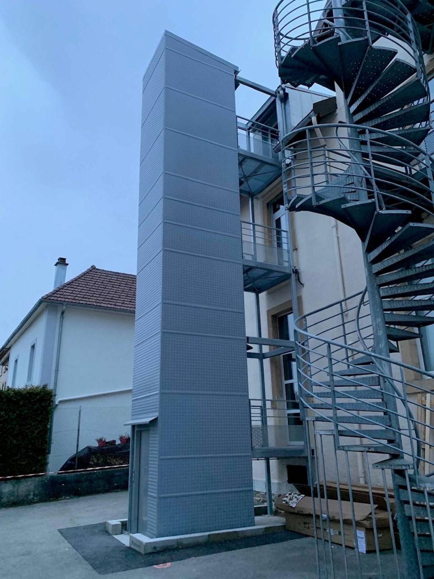 Installation en extérieur d'un élévateur vertical électrique 3 niveaux avec portes telescopiques et course de 9 mètres en Avignon